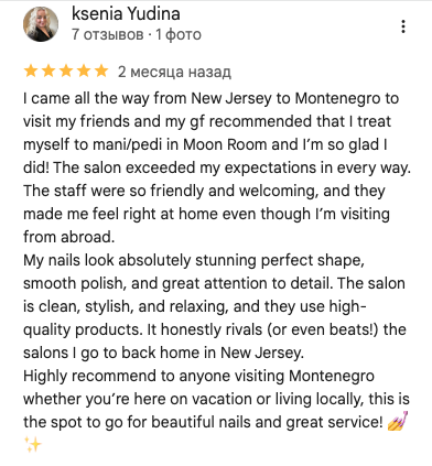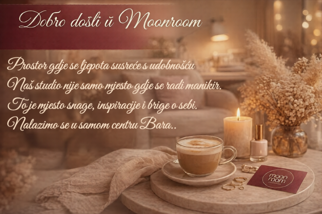 Moonroom — prostor gdje se ljepota susreće s udobnošću. Naš studio nije samo mjesto gdje se radi manikir. To je mjesto snage, inspiracije i brige o sebi. Nalazimo se u samom centru Bara. Na raspolaganju imamo veliku i praktičnu parking-zonu — kako bi vam dolazak bio lak, a odlazak bez žurbe.
