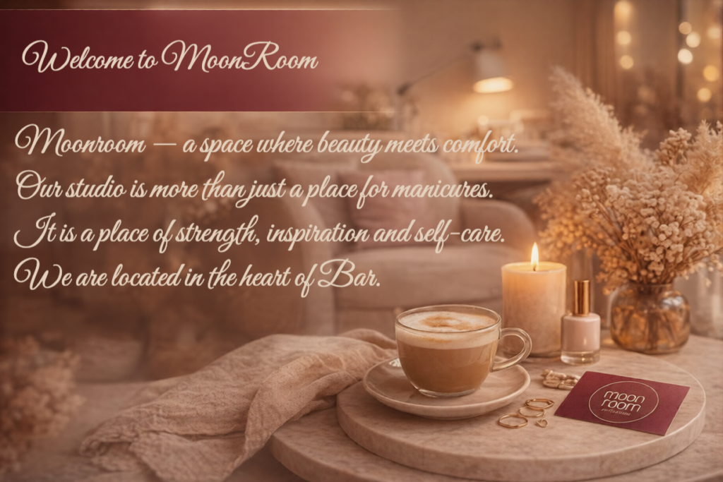 Moonroom — a space where beauty meets comfort. Our studio is more than just a place for manicures. It is a place of strength, inspiration and self-care. We are located in the heart of Bar. We have a large, comfortable space at our disposal, which makes it easy to arrive and a pleasure to leave.